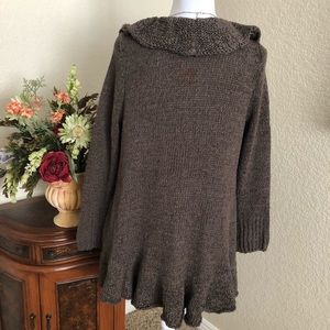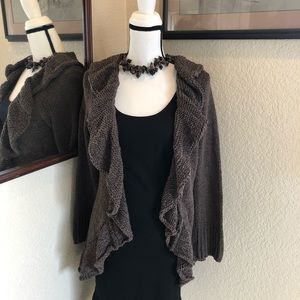 Gorgeous Ribbon Knit Chunky Cardigan Sweater with Ruffled Collar, Front And Hem, Ribbed Cuffs, Hook Close