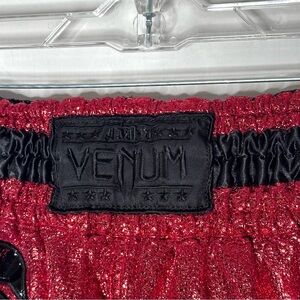Shiny red boxing shorts with black accents. Bold Venum branding. Perfect for training or competition.