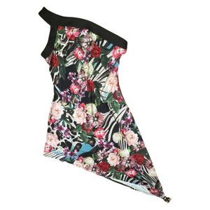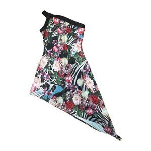 • Venus Asymmetrical Tropical Print dress size M, sleeveless, one shoulder strap, one open shoulder length short on one side, long on the other. Form fitting top with flowing bottom