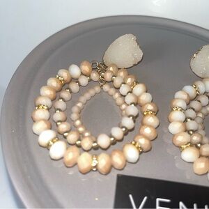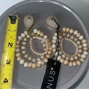 Add a pop of elegance and boho flair with these Venus triple hoop beaded statement earrings. Featuring layered hoops of faceted blush, ivory, and gold-tone beads, these earrings make a bold, stylish impact. The top stud is a faux druzy stone with a soft shimmer, set in gold trim for a luxe look.