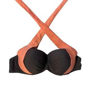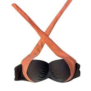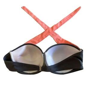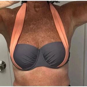 Fabulous bikini top. Gray with coral straps. Can be two ways, as shown. Tag is missing. I’m a 36C and fits perfect. See picture. Wore one time. Like new. No defects, snags or anything else. Perfect condition. Can be worn with gray, black or coral bottoms.