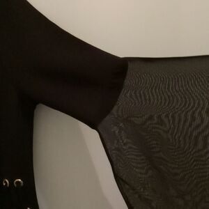 Venus Black Mini Dress with Gold Grommets & Sheer Sleeves size XS. 95% poly 5% elastane. in excellent condition. added info. sleeves are sheer 1/2 way down as seen in last pic