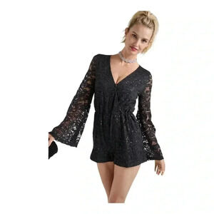 Venus Black Sequin Lace Open Back Bell Long Sleeves Romper Elastic Waist Size L