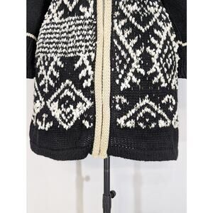 Black and white geometric knit pattern with cream trim. Soft acrylic blend with a slightly lighter knit — ideal for layering. Full zipper and ribbed cuffs.