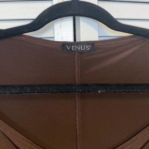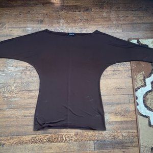 Barely worn. High level of elastane (not sure the actual percentage). Brown, boat neck, ¾ sleeve. Size XL