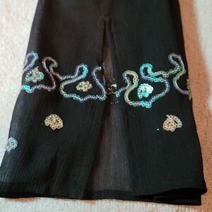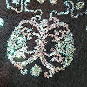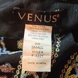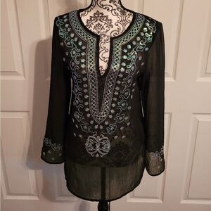 Stunning cover up. Made with polyester materials. Lightweight and flowy. Tag says size small. Tag has a little coloration on it. V neckline. Split sleeves and waist.
