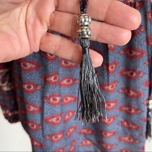 Features: Billowy balloon sleeves and beaded tassel that ties at the neckline. Relaxed oversized fit at midriff.