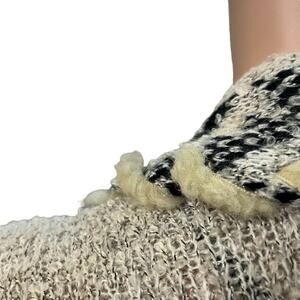 Soft acrylic knit cardigan. Bell sleeve. Hook and eye closures. Faux fur trim. Native American or Southwestern inspired geometric print.