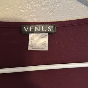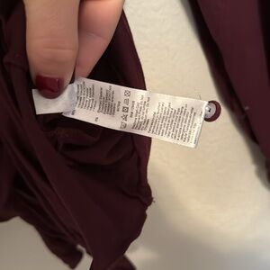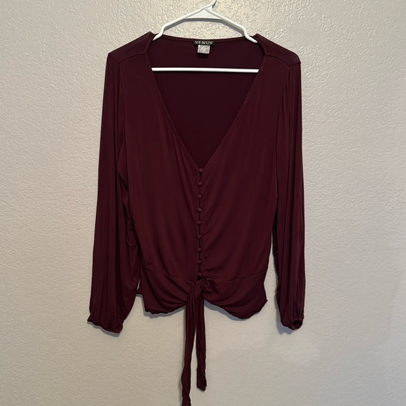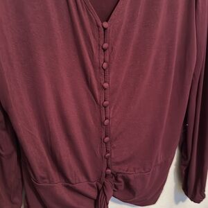 Soft and stretches, burgundy sleeved top, buttons down the front with tie bottom, no rips tears stains not owned by smoker home.