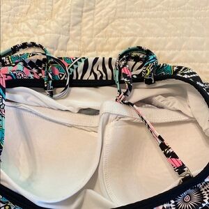 Vibrant tank top with a mix of colors and patterns. Features a tie detail at the bottom.