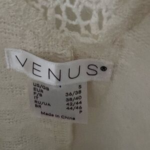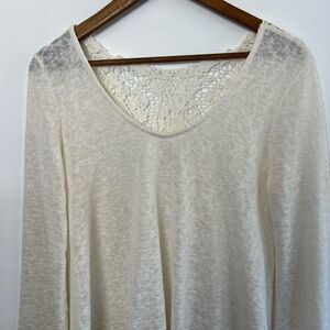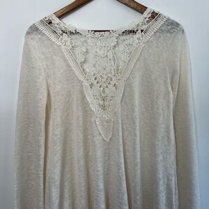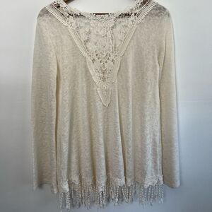 Venus Creamy White Sweater Crochet Lace V Back Fringe Bottom Bell Sleeves Small