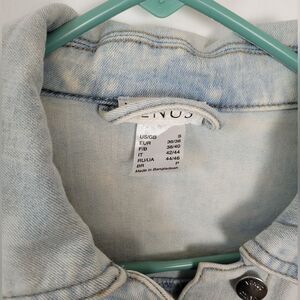 Cute denim jacket with an acid wash and cropped bodice and fringe trim. Full length sleeves with buttons on the cuff and button front closure. Two chest pockets. Good condition. Some minor signs of wear and one sleeve has more acid washing than the other. Size small measures approximately 18 inches long 20 inches underarm to underarm laid flat.