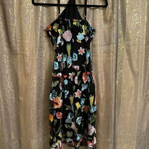 Brand new with tags, smoke and pet free home. No major flaws. There may be slight imperfections in the sewing of the flowers but nothing major or noticeable. I didn't see any but that is sometimes normal with embroidery. This dress is STUNNING. Flowers are sewn onto a mesh overlay, the dress is lined underneath. Adjustable straps on the beautiful high neck line. Classy, ethereal and feminine at the same time. Perfect for a special occasion, garden party, date night, birthday party or wedding guest dress. Size 6, mini-mid thigh length depending on your height.