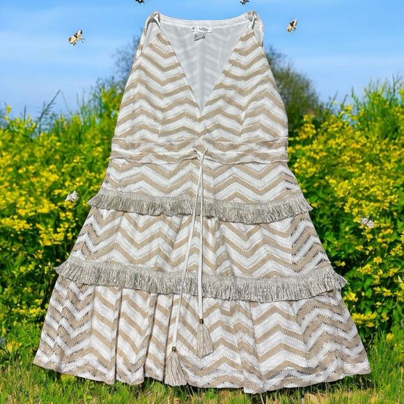Venus Dress Size 2 Ivory Beige Chevron Fringe Tiered Boho Mini Sleeveless Lined