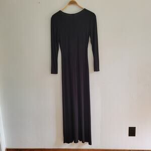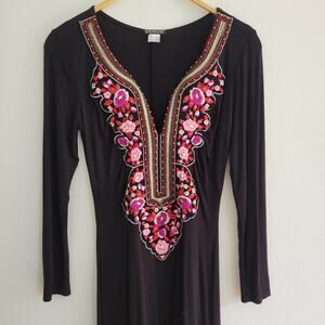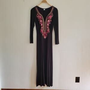 Venus Embroidered Placket Jersey Knit Maxi Dress Split Neck Long Sleeve Hippie