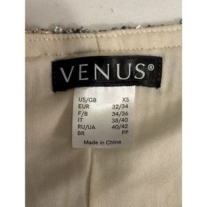 This is a Venus brand mini dress in size XS for women. It features a full sequin multicolor pattern and is made of polyester. The dress is a short 32 & 1/2 inches in length, making it a stylish and eye-catching choice for any special occasion. It is 13 & 1/2 inches across the chest with a low scoop neckline.