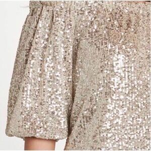 Get ready to make a statement with this stunning Venus off-the-shoulder dress. This dress is perfect for any holiday or NYE event. The golden sequined accents add a touch of glamour to the knee-length mini dress. The dress is designed with balloon sleeves and an off-the-shoulder neckline that adds a classic and elegant touch to the overall look. The dress is available in size small and is perfect for regular size types. The dress comes in a beautiful gold color that adds a warm and inviting feel to the overall look. The dress is perfect for women who want to make a statement and feel confident and stylish.