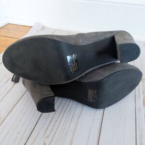 Venus Gray Faux Suede Heeled Bootie. Heeled ankle boots with fringe tie detail.