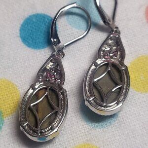 These prong set oval shaped gemstone lever back earrings offer a luxurious touch to any ensemble. Their stylish drop dangle with milgrain and metalwork design ensures style and elegance, making them a standout addition to your jewelry collection. Made from a hypoallergenic brass metal.