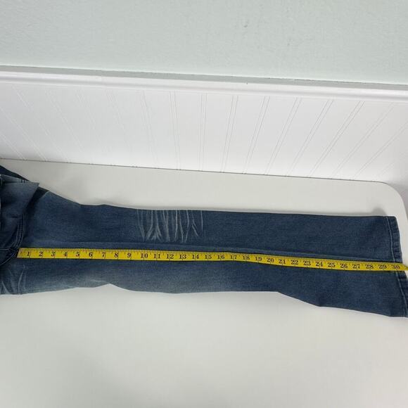 VENUS Fame distressed and embellished 5 pocket denim blue jeans. Featuring gems on and around the pockets and belt loops, even showing through the distressing. Really rad look. These bootcut jeans are in excellent distressed, pre-owned condition. Tag size 2.
