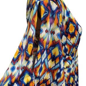 This Kaftan / Dress / Swim Cover-up by VENUS features a vibrant yellow and blue multicolored pattern with cold shoulder and elbow length flutter sleeves.