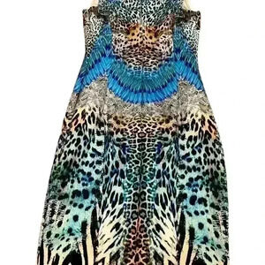 This Venus ladies form-fitting dress in vibrant blue, sea foam, and green in leopard print will be an eye catcher wherever you go. The neckline is amazing with beautifully detailed brass studs and gems will definitely catch attention!!! Questions? Leave a comment below( pit2pit 16’ Length 35’ Approximately)