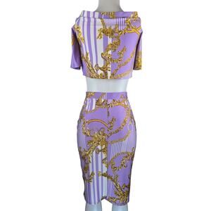 Venus Lavander Gold Chain Leaf Design Crop Blouse - Skirt Set Women's L NWT