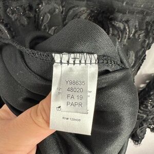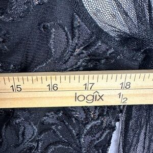 This stunning black mini dress by Venus features a deep V-neck, sheer polka dot mesh long sleeves, and dramatic bell cuffs for a bold, romantic silhouette. The velvet baroque burnout overlay adds luxe texture and drama, perfect for gothic, boho, and whimsigoth aesthetics. Size Large. Back zip closure. Fully lined. Excellent condition — no flaws noted.