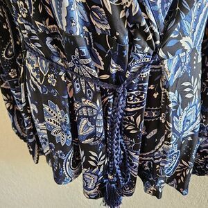 This is a long sleeved faux wrap blouse by Venus. It features paisley print in shades of blue and a drawstring tie around the waist with tassels. Note that each cuff has elastic in it. This top is longer in the center than on the sides.