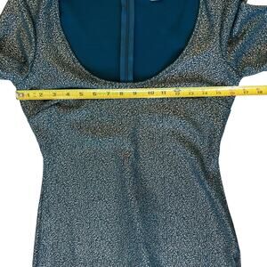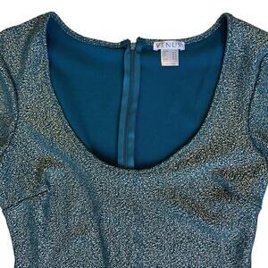 Venus Women's Size Medium Holiday Party Dress Teal & Metallic Gold Asymmetrical Flare Sleeve Retro Holiday