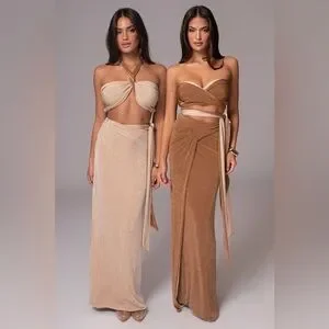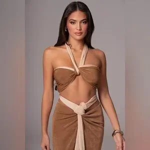 Unlock a world of style versatility with our Reversible Collection. Style meets versatility with our White/Black Venus Reversible Skirt Set. This modern set includes a bandeau-style top with multi-way straps that can be wrapped in various ways for customizable looks. The matching high-waisted skirt features shirring and back tie straps that add a touch of elegance. Made from double-lined slinky fabric, this set can be reversed for a whole new look, giving you two styles in one. Sold as set. Stretchy.