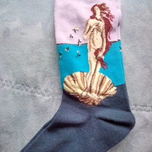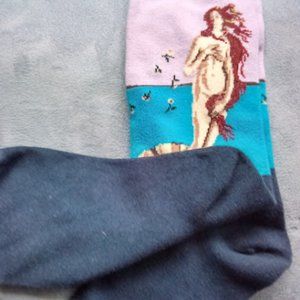 Not sure of the ilk of the shell but she's rising in all her nubile glory. Thank goodness for her long hair. Navy bottom, turquoise and pale lavender are the backgrounds of the top. Fits a size 9 foot. New no tags.