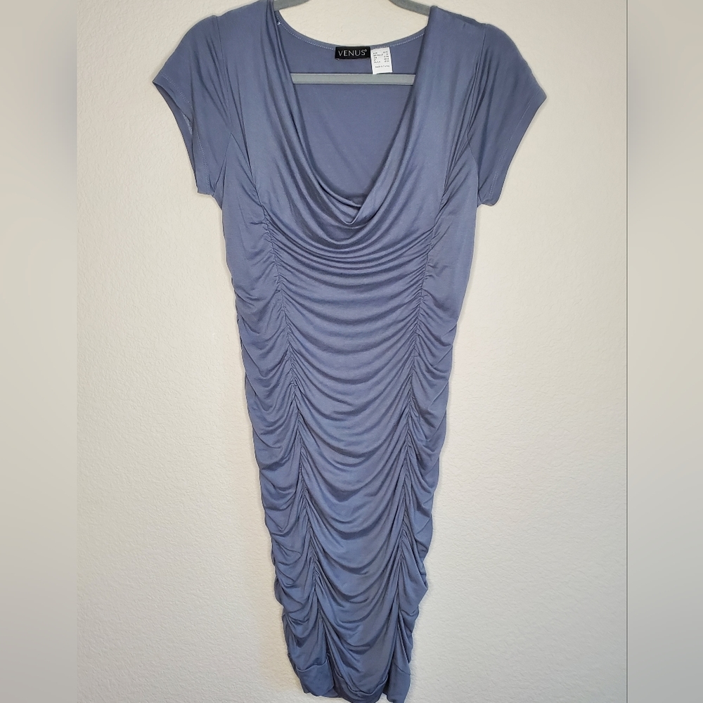 This elegant dress by Venus is heavily rushed with a lot of stretch. Very form fitting with a cowl neck and short sleeves. Beautiful slate blue!