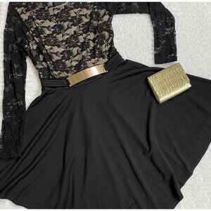 Excellent condition. Attached front belt with gold-toned detail. Front lace is lined in nude/beige. Sleeves and back lace upper back/rest of dress are unlined. Entire dress is stretchy. Both lace and lower skirt are stretchy fabric. Back zip closure. Super rare and impossible to find anywhere! Lovely!