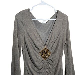 Venus T-Shirt Women's Medium Metallic Beaded V-Neck Ruched 3/4 Sleeve Top