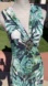 Elegant sleeveless maxi dress with a tropical palm leaf print. Features a flattering V-neckline and a decorative brooch detail.