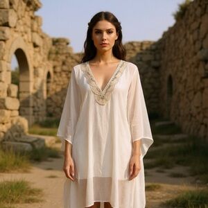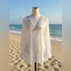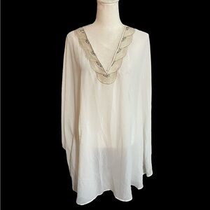 Venus Tunic top Cape white metallic bead size medium sheer Vneck gold embroidery