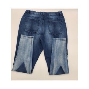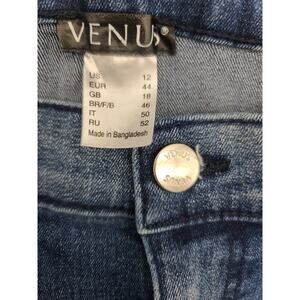 Venus Women Sz 12 Two-Tone Denim Skinny Jeans. These trendy blue denim jeans with contoured seams and a sweetheart-shaped yoke below the waistband that gives the illusion of a lifted, curvier booty. Perfect for casual wear. Light/dark wash, 5 pocket styling, mid rise, button and zipper closure, 81% cotton, 18% polyester, 1% elastane. Machine wash. Excellent condition. Measurements with flat lay in inches: