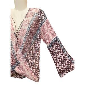 Features: Bohemian-inspired print, surplice neckline (wrap style), long sleeves, lightweight fabric (likely sheer or semi-sheer), relaxed fit.