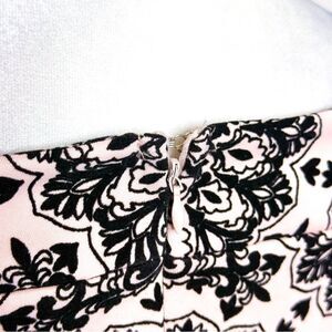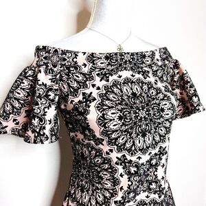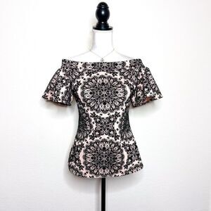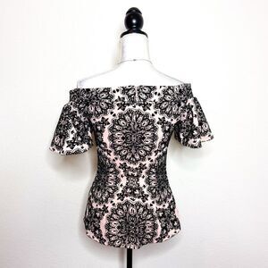 Elegant off-shoulder top by Venus in a soft light pink base with intricate black velvet detailing. Features flared sleeves and a back zipper closure for a chic, fitted look. Perfect for special occasions or date nights.