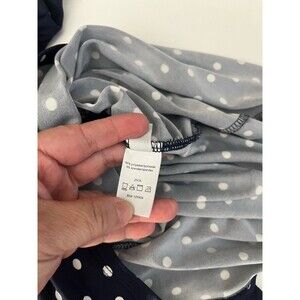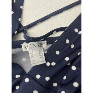 The Venus Womens Romper in size Large features a playful polka dot pattern in blue, with a comfortable elastic waist and V-neckline. This stylish one-piece outfit includes a pair of shorts and is made from a stretchy polyester and spandex material, providing a flattering fit. The dolman sleeves add a touch of elegance to this romper, making it a versatile and trendy option for any woman's wardrobe.
