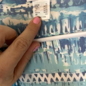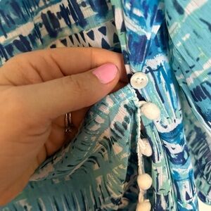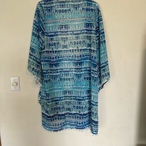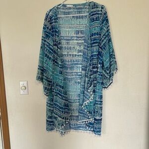 Beautiful blue and white coastal beachy swimsuit, cover-up that buttons to wrap up if you want or leave open wide Boho sleeves with pom-pom detail trim