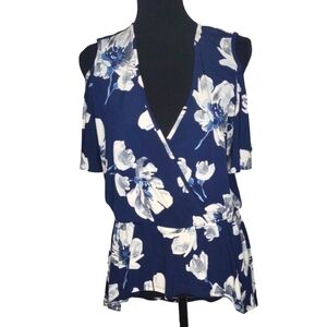 Venus blue and white V-neck cold shoulder high-low tunic, size Medium, EUC