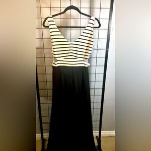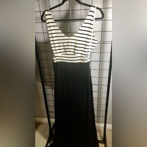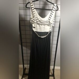 Fun and casual Venus maxi dress. Has a white and black striped top with a scooped v-neckline. Sleeveless style with an open back and side cutouts. Looks like a 2 piece outfit from the back and a maxi dress with side cutouts from the front. Skirt part is solid black. The top is lined and the waist is elasticized for a good fit. Measures about 18” p2p. Excellent used condition.
