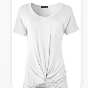 Venus White Twisted Knot Detail Short Sleeve tunic t-shirt, ladies small. Put a twist on your wardrobe basics- literally! This slouchy scoop neck comes together in the front to form a twisted knot detail, perfect for sprucing up your outfit with zero effort needed! One chest pocket. Rayon Spandex stretchy soft t-shirt fabric. The longer hem and relaxed fit make this short-sleeve tee an essential you can wear anywhere. Good pre owned condition, gently worn with very light signs of fabric wear on close examination. Excellent pre owned condition, no notable flaws.