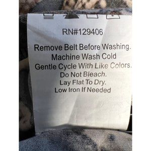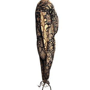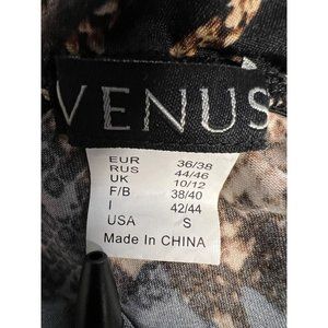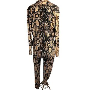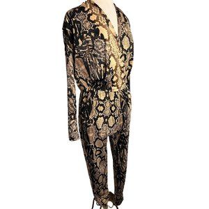 Stylish Venus woman's romper in small size with a snake print design. Features a v neck with snap long sleeves, elastic waist, two slash pockets, straight leg cut. Made in China from polyester and spandex blend. Machine washable. No belt included.