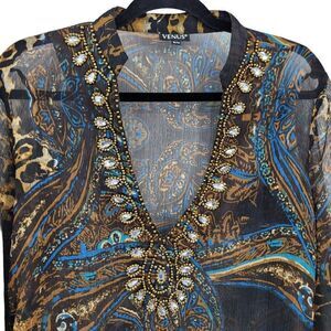 Venus Dress Sheer Peasant Resort Beaded V Mini Tunic Kaftan Paisley Brown Sz S/M