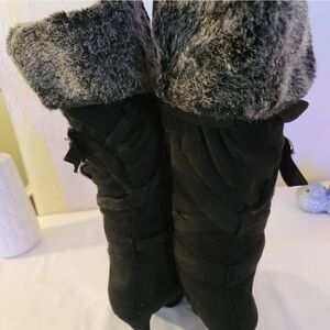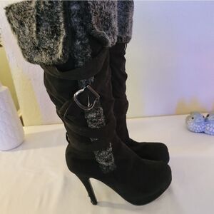 Black and grey, suede and fur high heels boots. aside from some fraying on the bottom of each boot shoes are in excellent condition. 5 inch heels. M3