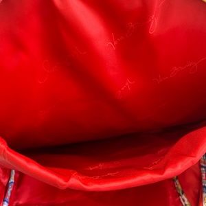 Small Vera Bradley backpack. Only ever used for school, and is slightly faded. Has 1 big pocket with a computer slot and 2 small pockets on the inside, and 1 small organized pocket on the outside. Has Both backpack handles and both cup holders on the sides.HAS BEEN CLEANED. It has some yellowing in the small packet and a pink stain.