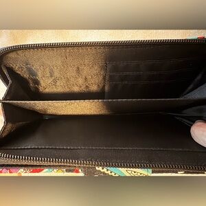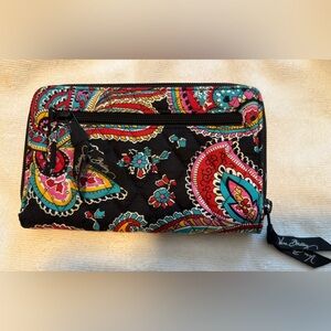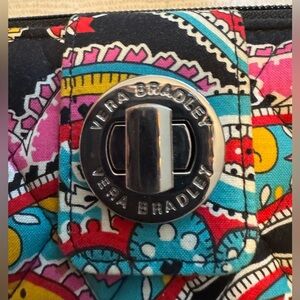 Vera Bradley turn lock wallet! It is in the Persian Paisley pattern. Talking about an organized wallet! It has six credit cara slots, check book slot a bill slot, and two clear ID slots in the fold open compartment. Then it has six credit card slots and a cash bill slot in one zipper compartment. It also has a separate large zipper coin pocket! The heavy duty turn lock keeps one compartment secure. The other two compartments have zipper closure. It is pre-owned